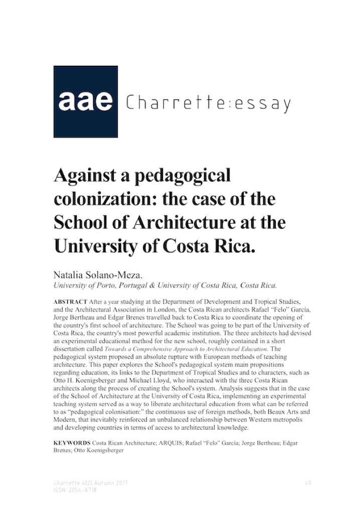 Solano-Meza, Natalia, Against a pedagogical colonization: The case of the School of Architecture at the University of Costa Rica, Journal: Charrette, The Journal of Architecture Educators, Autumn, 2017, pages 40-58. FULL TEXT