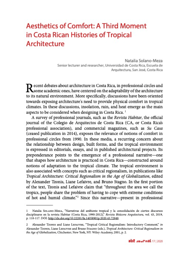 Solano-Meza, Natalia, Narrativas del ambiente tropical y la consolidación de ciertos discursos disciplinares en la revista Habitar (Costa Rica, 1990-2012), Revista Bitácora Arquitectura, Universidad Nacional Autónoma de México, Número 43, 2019, pages 110-117 FULL TEXT.